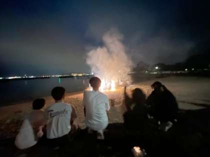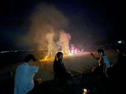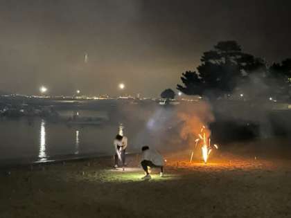浜辺での花火に歓声。