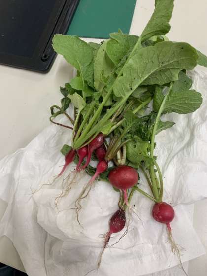特別支援学級の3年生が種から育てたラディッシュ1回目の収穫をしました。