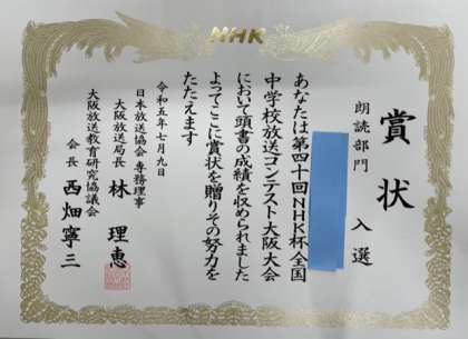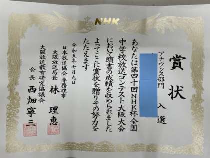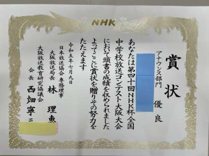 放送部がNHK全校放送コンテスト大阪大会に出場し、優良賞と入選という素晴らしい活躍をしました。