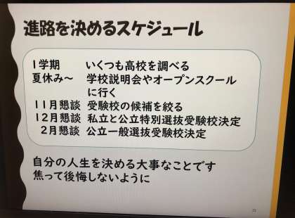 中学卒業後の進路のことや、私立高校と公立高校のそれぞれの良い点、専願と併願の違いなど、進路選択の上で知っておかなければならないたくさんの情報を教えていただきいました。