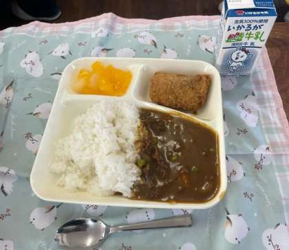 今日の給食はカツカレーライスとフルーツゼリーでした。おかわりするほど人気で、みんな美味しそうに食べていました。