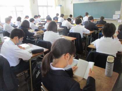 新学期がスタートして、約一週間が過ぎました。写真は1年生の「朝の読書」の様子です。生徒たちは、自分の読みたい本を選び、読書に集中していました。