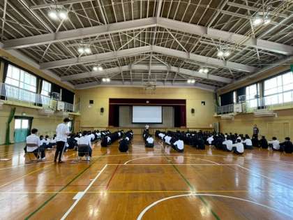 3年生は朝の学年集会で修学旅行に持ってきて良い物と持ってきてはいけない物の確認をしました。