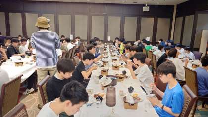 食事開始です。 エビフライの大きさにびっくりしながら食事を楽しんでいます。