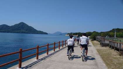 島内散策の最後は美しい景色を見ながらのサイクリングです。 海が青々として綺麗です。