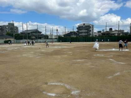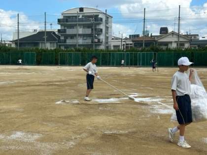 サッカー部、ラグビー部、野球部でお盆休みの前にグラウンドでにがり撒きを行いました。