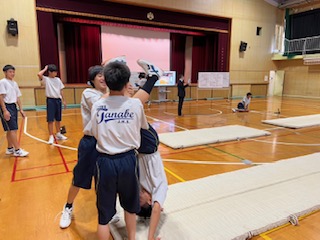 1年1組2組の男子体育では、タブレットの「追いかけ再生機能」をマット運動に用いて、自分のフォームを確認しました。