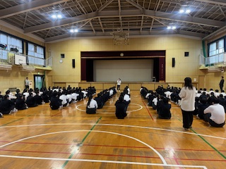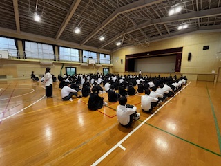 奥田先生が「村祭」のお話を通して、修学旅行、誰かがするだろうの気持ちによって、ダメになってしまう。頑張ってくれている人がいる中で、自分の出来ることで協力して、いい修学旅行にしようね。とお話しくださいました。