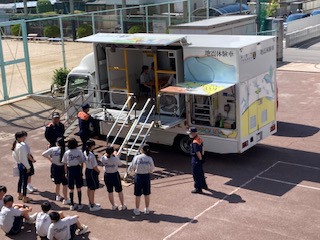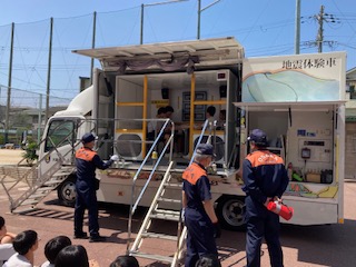 「阪神・淡路大震災」を再現した揺れや、「南海トラフ地震」を想定した揺れを起こす体験車に4人ずつ乗りました。想像していたよりも大きな揺れに驚きました。