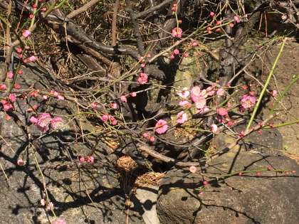 正門前の築山の梅がほころび始めました。今日は立春です。