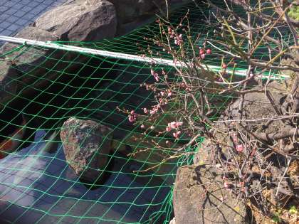 梅の下では、冷たい水の中を錦鯉たちが元気に泳ぎ回っていました。