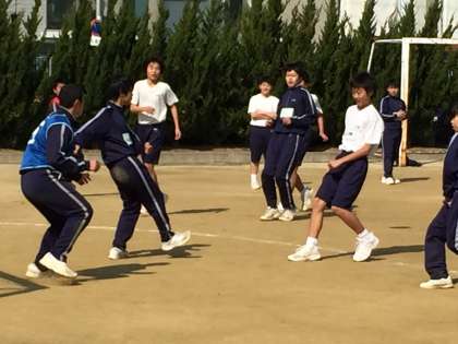 春を感じさせる明るい陽射しの中を真剣にゲームに取組む2年生。