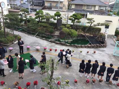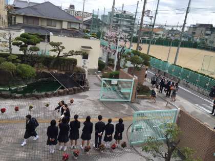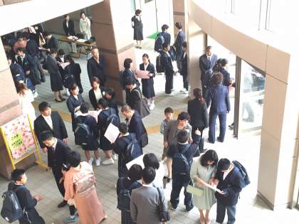 元気に中学校の門をくぐった新入生を生徒会役員の皆さんが元気な挨拶で迎えました。