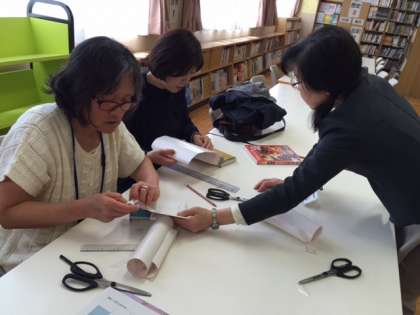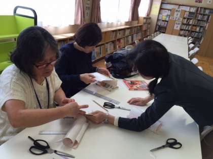昼休みの図書室では、文化委員さんが、元気アップのボランティアさんと一緒に本にブッカーを貼りました。