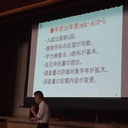 入学者選抜について、また、チャレンジテスト・大阪市統一テストなどについて説明しました。1年生の評定から入学者選抜における調査書に記入されるので、日々の授業を大切にして、目標を持って頑張れるよう、学校と家庭が協力していきたいと思います。