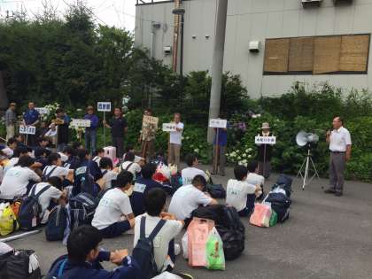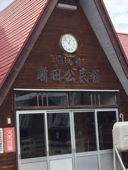 民泊のオーナーさんに迎えていただき、白馬村、新田公民館前で入村式を行いました。