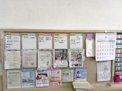 3年生の教室では高等学校の体験入学の案内等、きれいに仕分けして分かりやすく掲示されていました。担任の先生に聞いてみると、生徒たちが頑張ってくれているそうです。