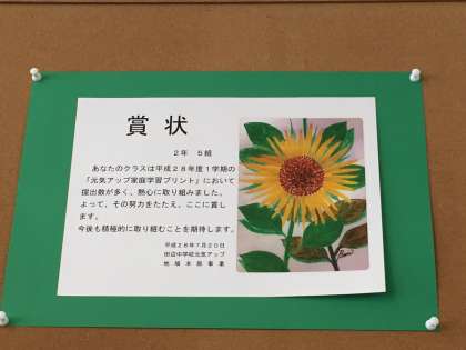 2年生の教室では「元気アップ家庭学習」の表彰状が掲示されていました。2学期も頑張ってくださいね☆