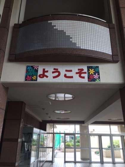 玄関ホールの『ようこそ 田辺中学校へ』飾りがステンドグラス風に変わりましたよ☆