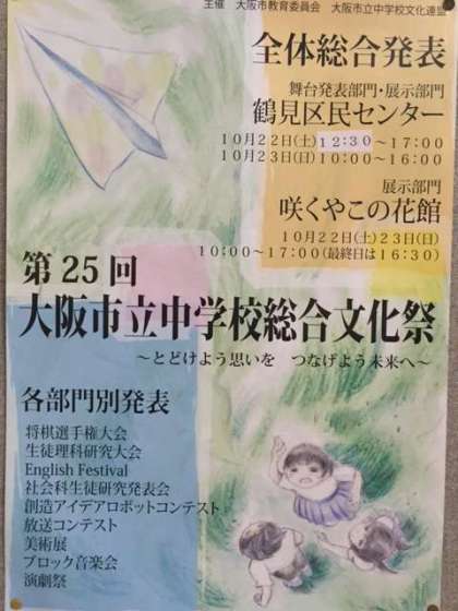 第25回大阪市立中学校総合文化祭が鶴見区民ホール、咲くやこの花館で開催されています。田辺中学校からは舞台部門で明日の放送全般、展示部門では家庭手芸で発表しています。