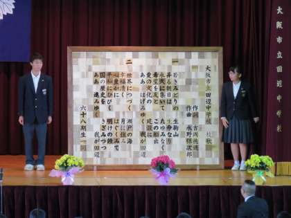 3年生が創立70周年を祈念して制作した『校歌レリーフ』をご披露しました。このレリーフは玄関ホールで田辺中学校と生徒たちを永遠に見守ってくれます。