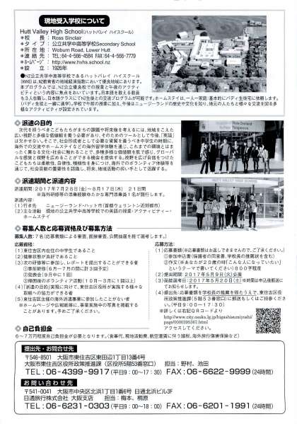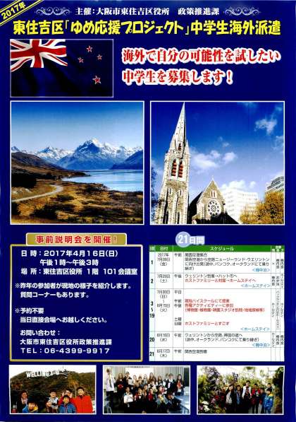 東住吉区「ゆめ応援プロジェクト」中学生海外派遣の案内がきています。希望される方は、応募書類をお渡ししますので、田辺中学校教頭まで連絡してください。