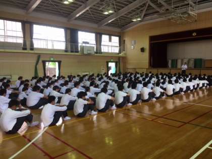 3年生は7月1日(土)に行われる出前授業についての説明を体育館で聞きました。