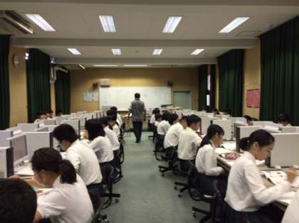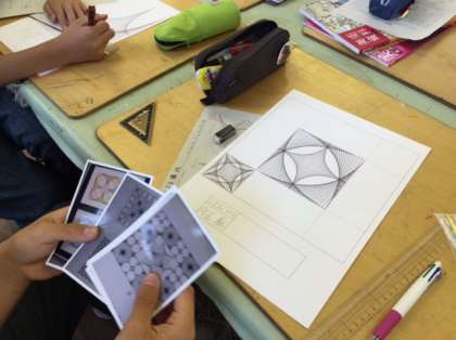 美術科では、デザイン分野「平面構成」の単元。正しく作図をすることを目標に、先生手作りの資料を見て、考察していました。