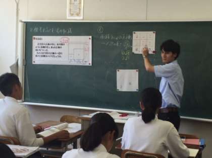 数学「平方根」は図表を掲示して、生徒にとって分かりやすい授業作りの工夫が見られました。生徒も先生も頑張ってます・・・☆