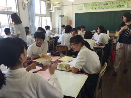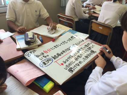 単元は井上ひさしの『握手』  人物像をとらえ、人間関係について意見を持つことを目標にホワイトボードシートを活用してグループワークを行いました☆