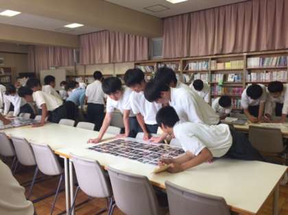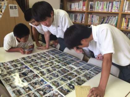 懐かしい楽しい思い出写真を選ぶとあって生徒たちの顔もほころんでいます。