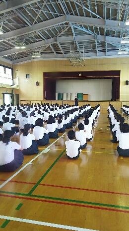 体育館はとても暑いですが、しっかり話を聞いていました。