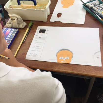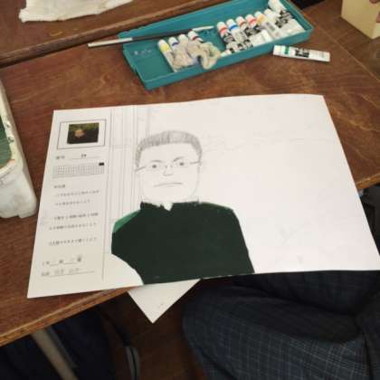 1年生では合唱コンクールの練習や一泊移住の写真をもとに「みんなで描く学級写真」を作成していました。自分の顔を担当したり、教頭先生の担当者もいました。