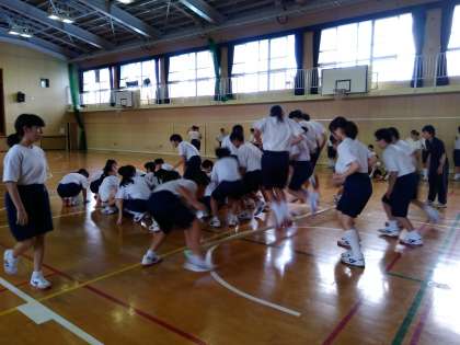 体育大会に向けて、2年生では学年種目の『台風の目』の練習を頑張っています。