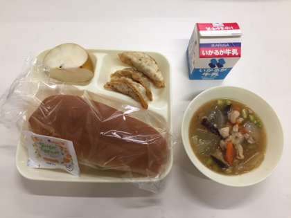 【あげギョーザ・鶏肉ととうがんの中華煮・なし(豊水)・パン・アプリコットジャム・牛乳】
