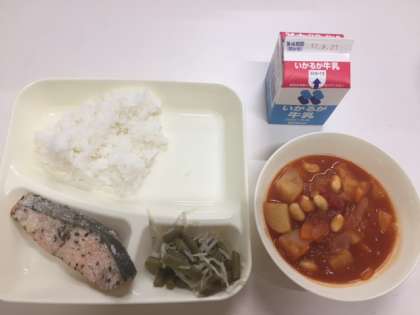 【さけのバジル焼き・大豆とごろごろ野菜のトマト煮・三度豆ともやしのサラダ・ごはん・牛乳】