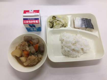 【さごしの塩焼き・じゃがいもと一口がんもの煮物・キャベツときゅうりのゆずの香あえ・ごはん・牛乳】
