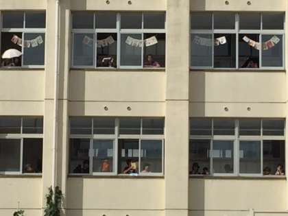 小学生たちはとっても元気に頑張っていました。運動場が狭いので、校舎廊下から観戦できるように工夫されています。