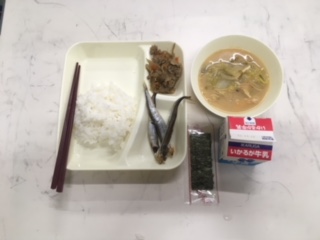 【焼きししゃも みそ汁 きんぴらごぼう 焼きのり ご飯 牛乳】