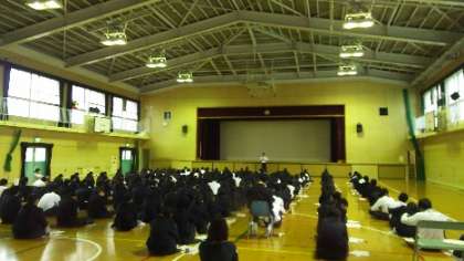 9日、10日の職場体験に向けて、体育館で事前指導がありました。