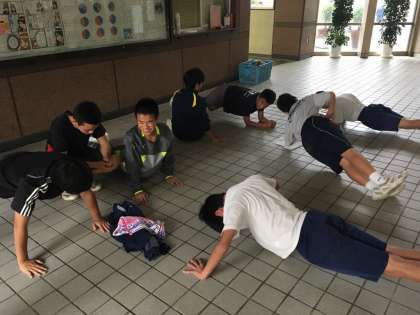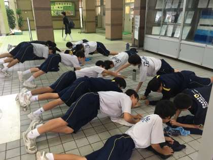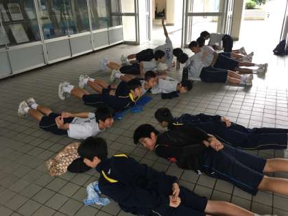 雨で活動場所が狭かったので、ラグビー部と男子テニス部の合同でトレーニングをしました。ラグビー部がトレーニングを教えながら、真剣に取り組んでいました。