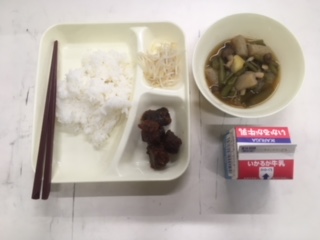 【くじらのオーロラ煮 じゃがいもとこんにゃくの煮もの もやしのゆずの香あえ ご飯 牛乳】