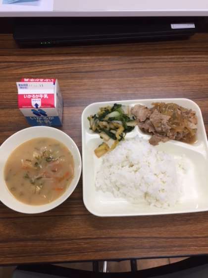 【豚肉のしょうが焼き・さつまいものみそ汁・菊菜と白菜のごまあえ・ごはん・牛乳】