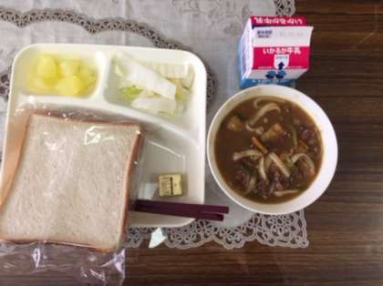 【カレーうどん・白菜の甘酢和え・りんご(缶)・食パン・バター・牛乳】