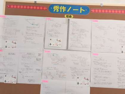 学年のフロアーに掲示板を2つずつ用意して、素晴らしいノートを各教科で選び、掲示します。生徒の皆さんは友達の優れたノートを見て、自分のノートの参考にしてほしいと思っています。