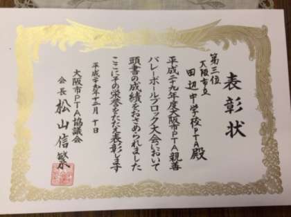 12月10日(日)に開催された「平成29年度 大阪市PTA親善バレーボールブロック大会」 第3位の賞状をいただきました。