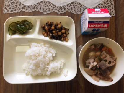 【筑前煮・ひじき豆・きゅうりのかつお梅風味・ごはん・牛乳】