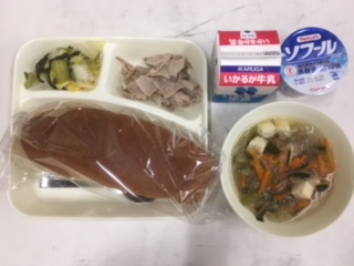 【豚肉のオイスターソース焼き 糸寒天のスープ ピリ辛あえ ヨーグルト ライ麦パン 牛乳】