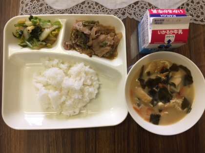 【豚肉のごまだれ焼き・みそ汁・きくなとはくさいのおひたし・ごはん・牛乳】