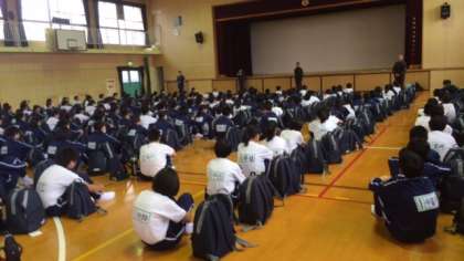 雨のため体育館での出発式ですがみんな元気です。